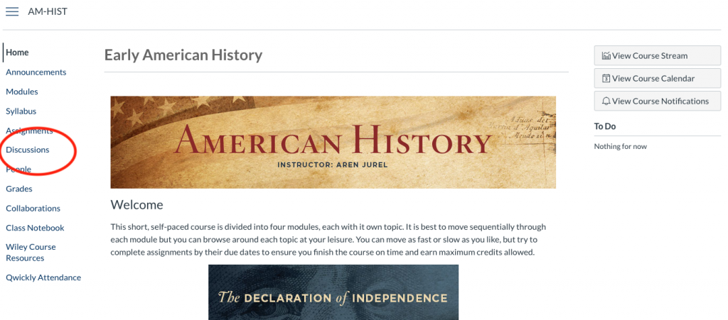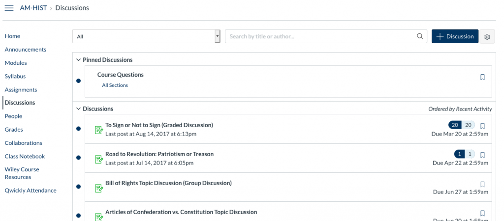 As a requirement of some courses, professors set up Discussion Topics for students to answer or respond to.  This encourages participation between students and furthers educational growth on a topic through discussion.  By clicking on the “Discussions” section under the Course Navigation tab on the left, you are in the “Discussions” section where you can create threads and/or respond to posts by the professor and/or other classmates.