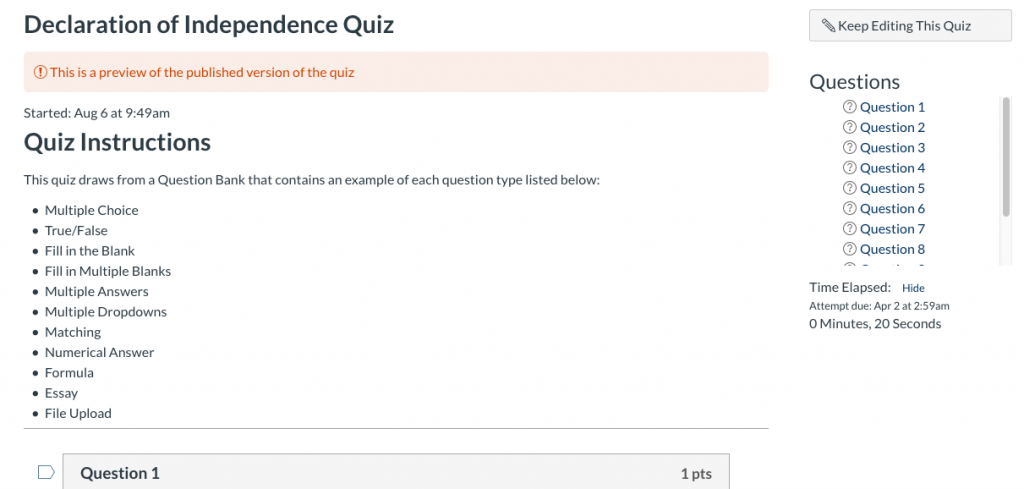 Begin answering the questions.  Each professor may have a different layout or format of the test but the general format looks like this. Click the submit quiz button at the bottom when you are finished. You will get a confirmation popup asking you to verify that you are ready to submit your assessment.
