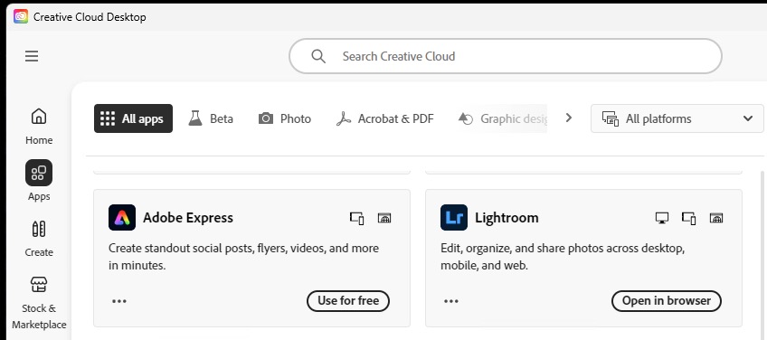 5. Once the application loads, click Apps on the left menu, and scroll down until your see Adobe Express and select Use for Free